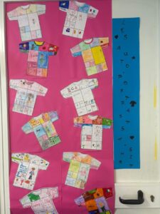 De retour en classe, nous avons joué au jeu de l’oie afin d’apprendre le vocabulaire du jardin : serfouette, griffe, bêche, arrosoir, plantoir, transplantoir, godet, semis…