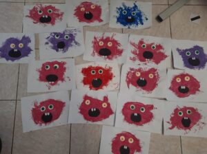 Nos monstres d’Halloween. Nous avons peint avec de la peinture et une fourchette. Nous avons collé les yeux avec des ronds en papier puis la bouche avec du papier noir et les dents avec du papier blanc.
