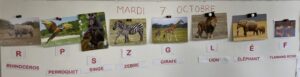 D’abord on a réfléchi ensemble, en petits groupes : chercher la première lettre (on a vérifié aven retournant les images, le mot était écrit derrière), puis retrouver les mots à partir de l’initiale (il fallait bien lire de la gauche vers la droite pour ne pas confondre la première et la dernière lettre !)