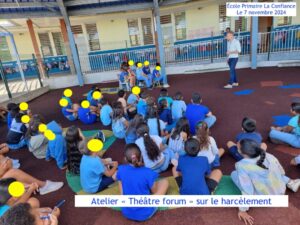- Les CE2, CM1, CM2 ont eux participé à un “théâtre forum”: chacun pouvait intervenir lors des saynètes montrant des situation de harcèlement scolaire.