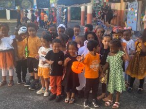 Nous avons défilé à l’extérieur et à l’intérieur de l’école pour Halloween. C’était un super moment et l’occasion pour nous de nous transformer en petits monstres pour réclamer des bonbons. Nous avons dansé, chanté et nous nous sommes amusés.