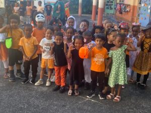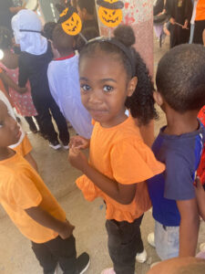 Nous avons défilé à l’extérieur et à l’intérieur de l’école pour Halloween. C’était un super moment et l’occasion pour nous de nous transformer en petits monstres pour réclamer des bonbons. Nous avons dansé, chanté et nous nous sommes amusés.
