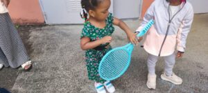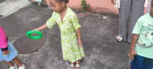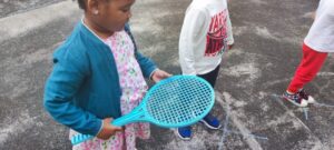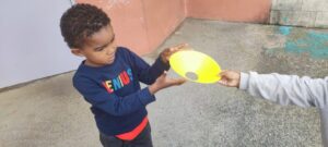Les élèves forment une longue chaine des pompiers et manipulent différents matériels. Il s’agit de les amener à agir avec différents objets (prendre et donner de différentes façons) mais aussi à apprendre le lexique du matériel d’EPS (un plot, une raquette, un anneau, un cerceau etc), ainsi que les verbes d’action (je donne, je récupère puis je donne, je le fais passer ).