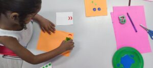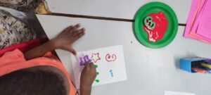 Les élèves en atelier dirigé avec la maitresse, tamponnent le nombre demandé (1 2 3), tracent la quantité de ronds qu’il faut, collent la quantité de gommettes puis tamponnent la quantité de formes correspondant au nombre. travaillé.