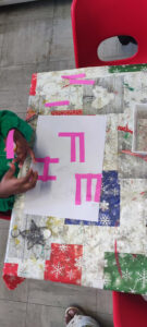 Dans le développement et la structuration du langage écrit, il s’agissait pour les élèves de travailler la maitrise du graphisme des lignes verticales et horizontales pour commencer à tracer les lettres droites (bâton) : E F I T L H
