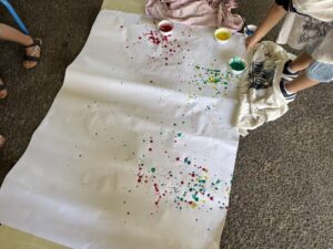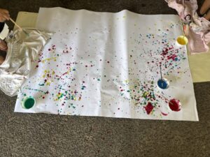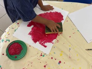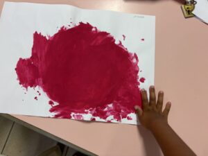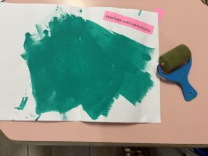 – Le coin peinture : on y fait de la peinture avec la main, les rouleaux, le pinceau …