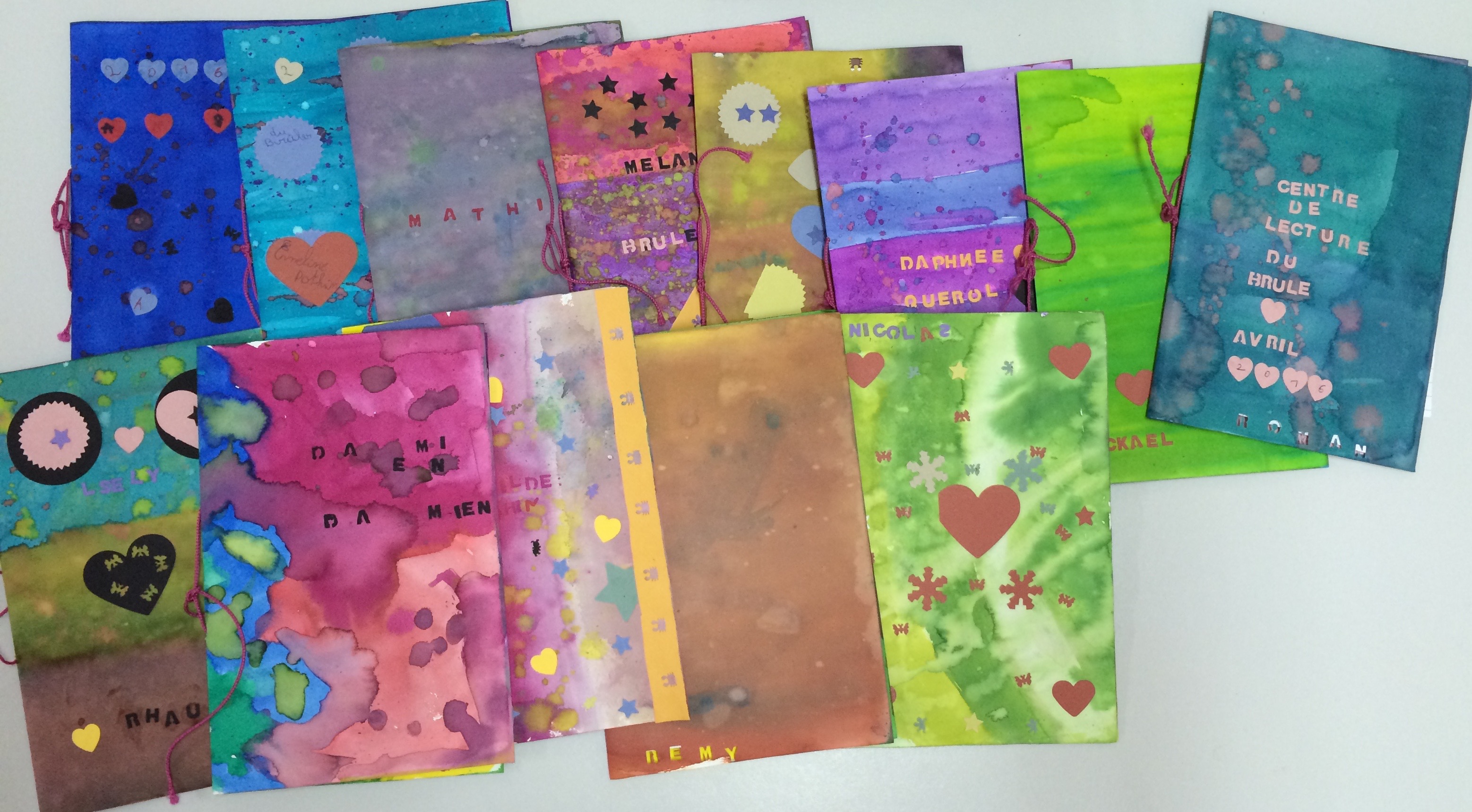 Nous avons utilisé des encres pour réaliser la couverture de notre carnet. A la façon de Pollock, nous avons tout couvert puis fait des tâches avec d’autres encres ou de l’eau afin de diluer l’encre. Pour finir, nous avons perforé et décoré le carnet.